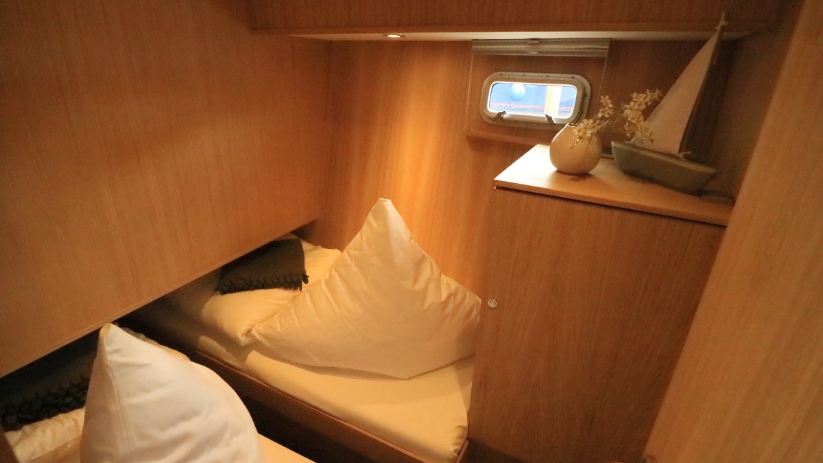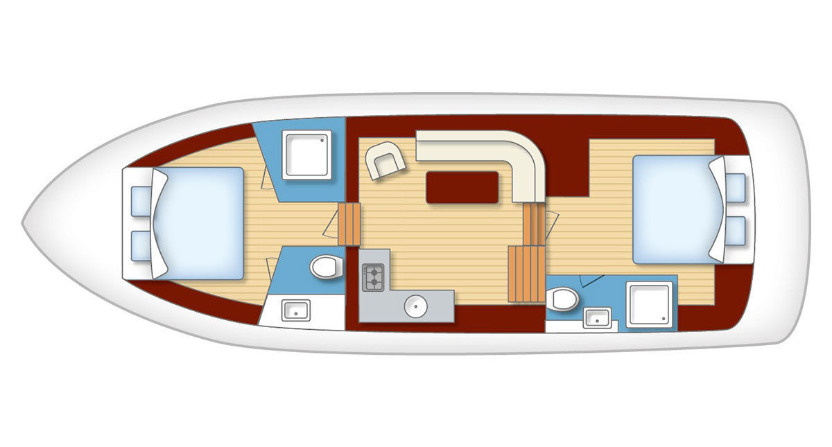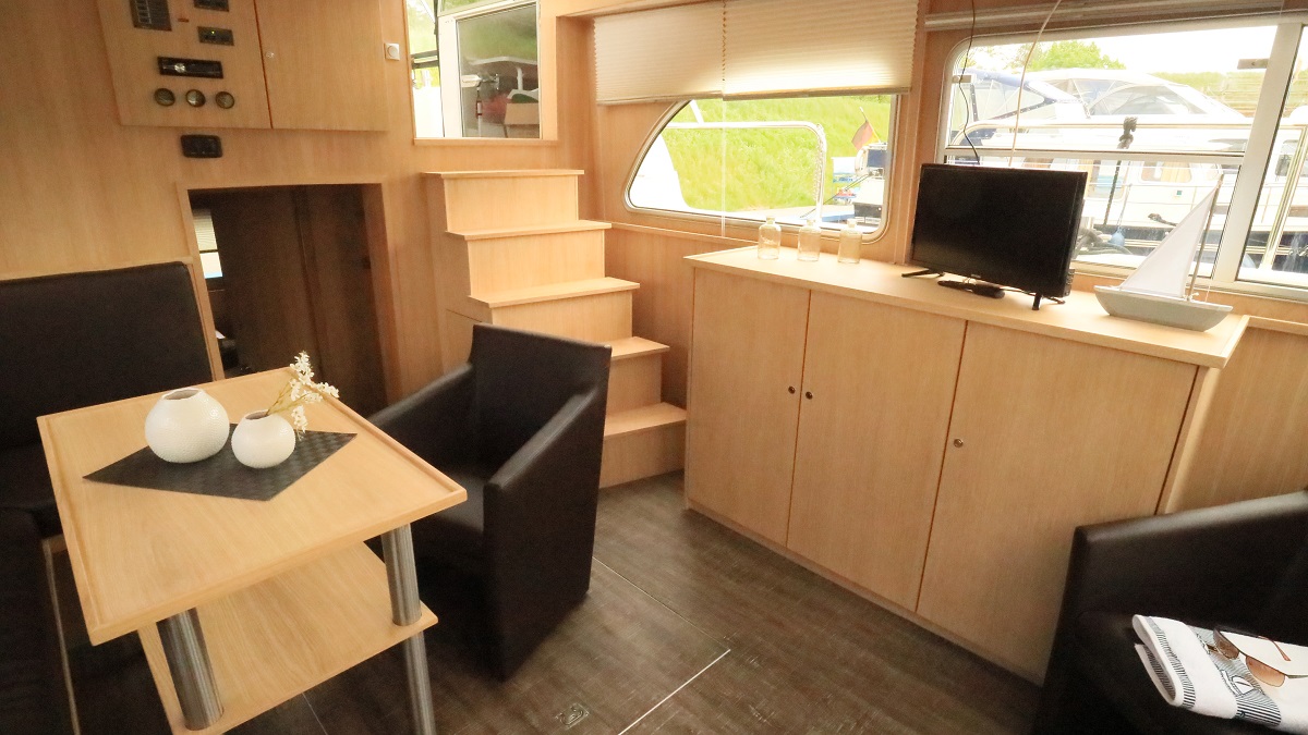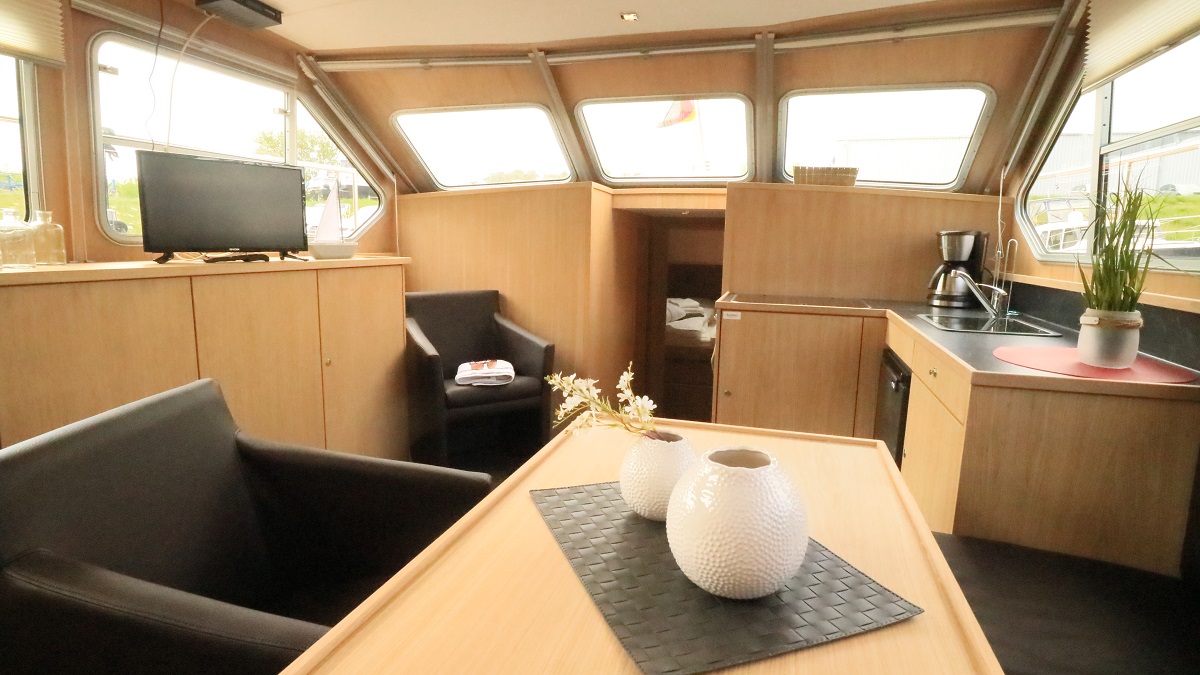 Mit dieser Yacht setzen Sie ein Zeichen auf der Müritz! Denn diese sticht nicht nur durch die ungewöhnliche Färbung heraus, sondern auch durch zwei echte Sonnenplätze auf dem Vorderdeck. Helle Hölzer im Innenbereich verleihen dem großen Salon mit integrierter Küche ein „Hier-bin-ich-Zuhause“-Gefühl. Das betont auch der durchdachte Grundriss, der sechs Personen einen Idealurlaub auf dem Wasser ermöglicht.