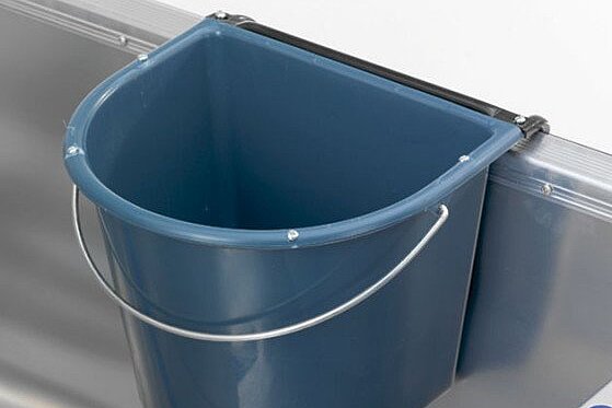 Marineblauer Kunststoffeimer (UV-Schutz) mit Blauem Riemengriff und Aluminiumhalterungen zum Aufhängen an der Reling. Fasst 12 Liter.