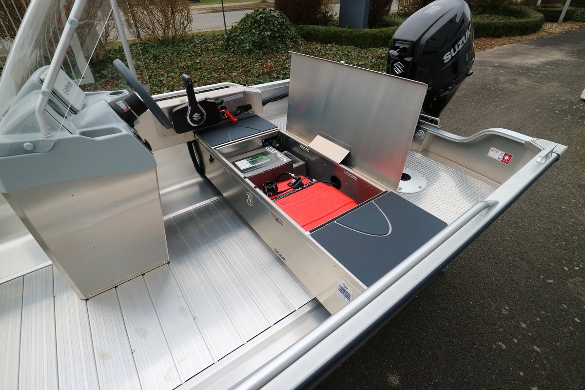 Motorplatte aus Blech. Zur Ergänzung des Elektromotorbetriebs neben dem Außenbordmotor, beispielsweise beim Trolling. Passend für Arkip 460 und alle Sportsman 445 Modelle, Max, Catch und Basic, mit Ausnahme von Sportsman 445 Catch mit Angelstuhl, wo wir u