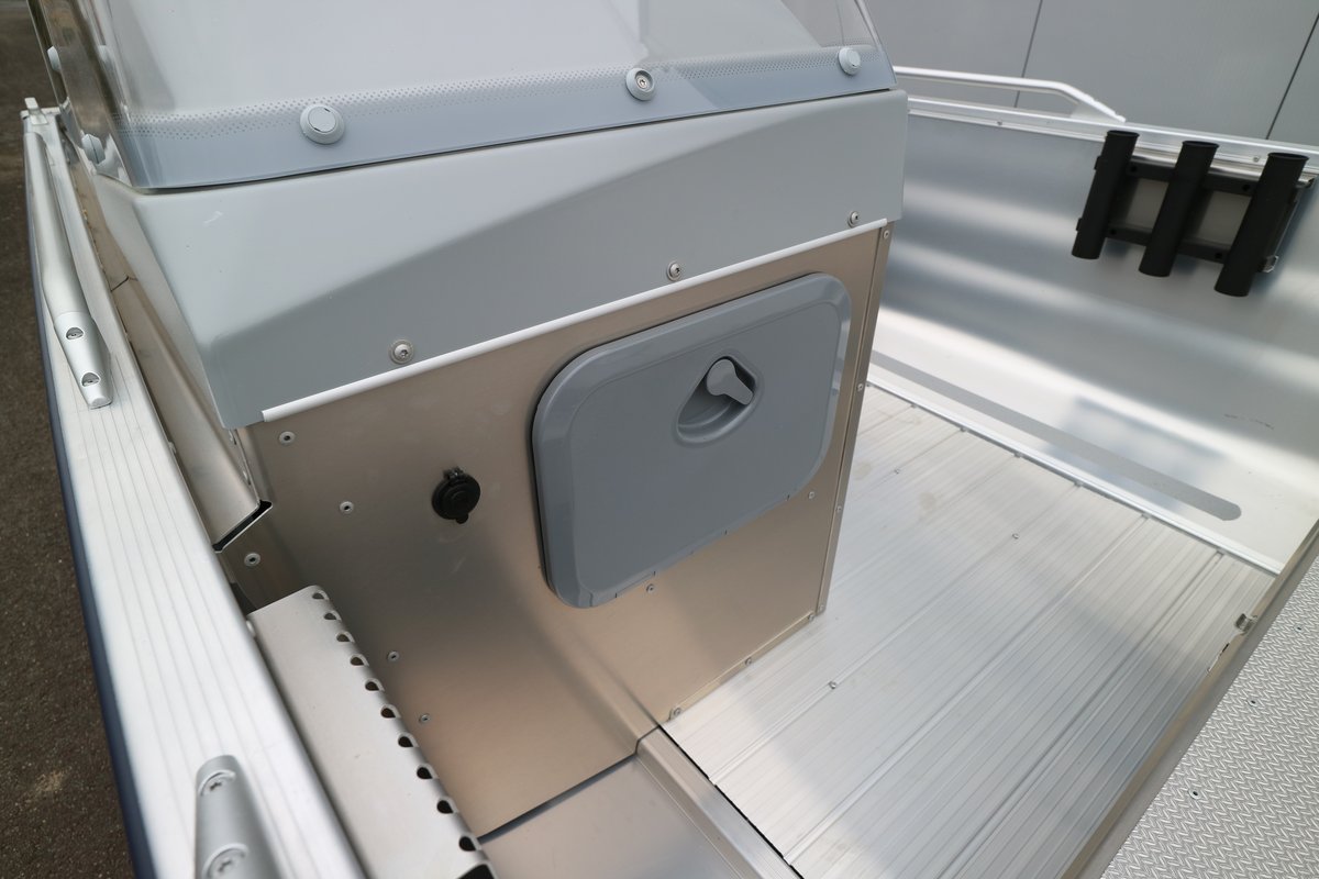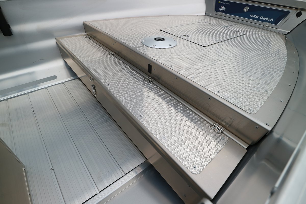 Ein aufgleitendes Angelboot für bis zu 3 Personen, geeignet für Meer und Binnenseen. Mit Angelplattform ausgerüstet. Bei der Entwicklung der 445 Catch wurden erfahrene Sportfischer zurate gezogen. Das Boot ist auch für einen ferngesteuerten Elektromotor am Bug vorbereitet. Die heutigen Elektromotoren lassen sich mit einer Fernsteuerung am Handgelenk steuern. Damit können Sie das Boot leicht auf der Stelle wenden.